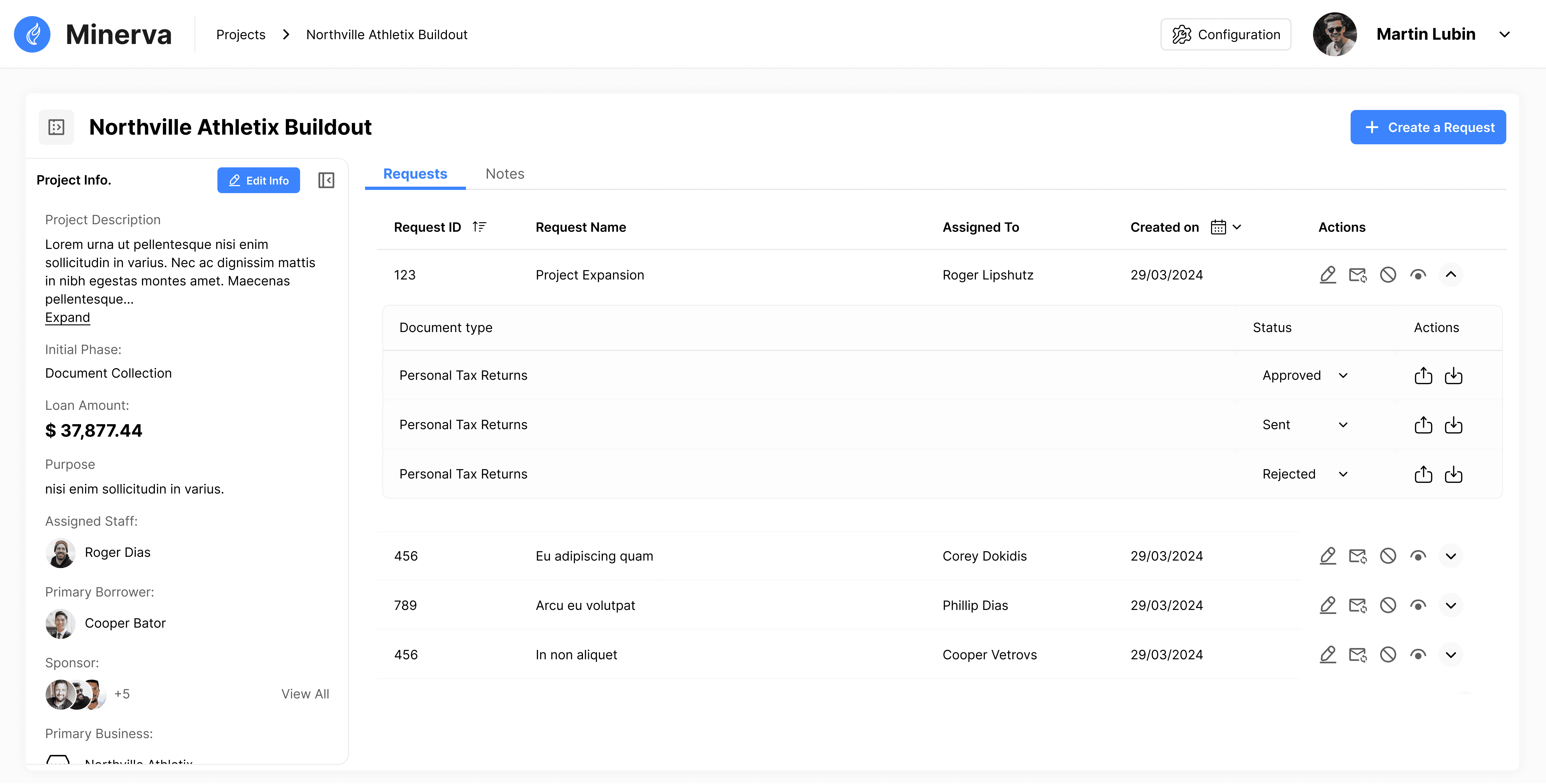 The Minerva dashboard elegantly streamlines financial project and loan request management with a focus on clarity and speed for enterprise users. The workspace is divided into clean card and table layouts—project overviews on the left, expandable lists of requests in the center, and detailed user, borrower, and staff information in immediate context.