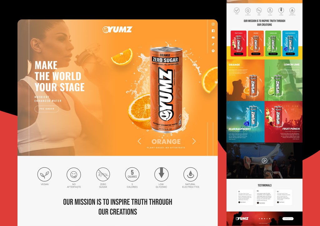 A vibrant, health-focused beverage website designed to showcase YUMZ’s range of zero sugar, plant-based enhanced water drinks with immersive product storytelling and energetic branding.